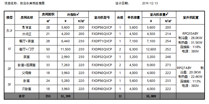 空調(diào)系統(tǒng)配置表