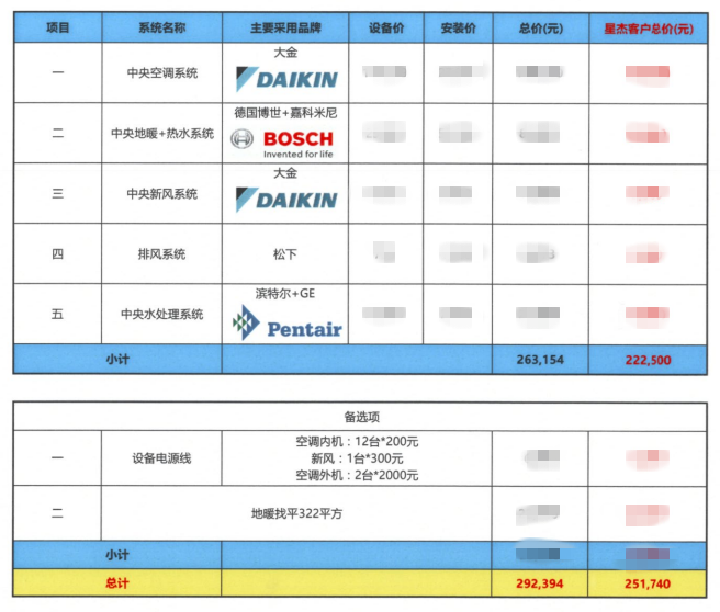 家居集成系統:大金VRV-P中央空調系統   大金新風系統  松下排風扇 博世歐洲之星鍋爐   嘉科米尼地暖管路系統    濱特爾中央水處理  威樂循環泵