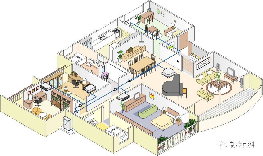 相對于其他類型的家用中央空調(diào),風(fēng)管系統(tǒng)中央空調(diào)雖然初投資小,引入新風(fēng)可有效改善室內(nèi)的空氣品質(zhì),但風(fēng)管系統(tǒng)的空氣輸配系統(tǒng)所需的建筑空間較大,一般要求住宅有較高的層高,同時它后期運(yùn)行噪音較大,運(yùn)行費(fèi)用高,因此針對家庭一般不推薦此類系統(tǒng)。