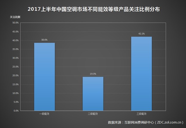 2017年上半年中國(guó)空調(diào)市場(chǎng)不同能效等級(jí)產(chǎn)品關(guān)注比例分布