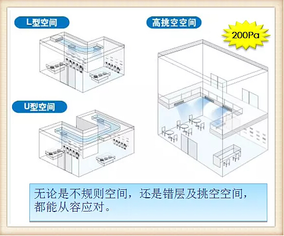 從機型來看,天花板嵌入式(環繞氣流)室內機,對應大開間和方形空間,氣流均勻,造型更美觀。溫度分布情況大為改善;天花板嵌入導管內藏式室內機,對應狹長型、U型和L型等不規則空間,有多種送回風形式,輕松實現與內裝的融合;自由靜壓風管室內機,對應不規則空間和挑高空空間,即使內裝格局經常改變,也能輕松對應。